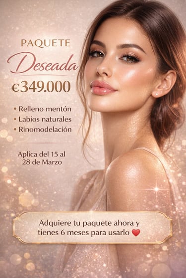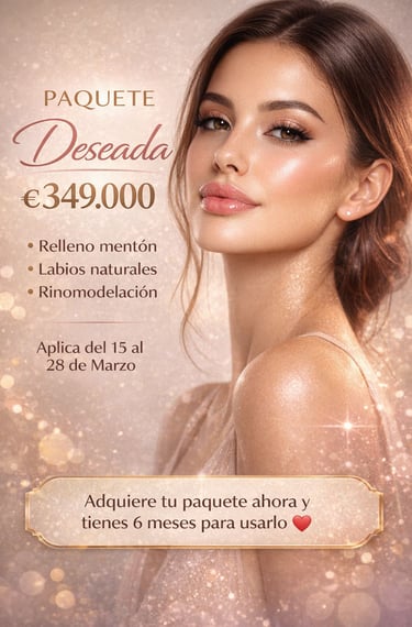 Llegó el Paquete Deseada por ₡349.000. Incluye relleno de mentón, labios naturales y rinomodelación. Aplica del 15 al 28 de marzo. Adquirilo ahora y tenés 6 meses para usarlo.