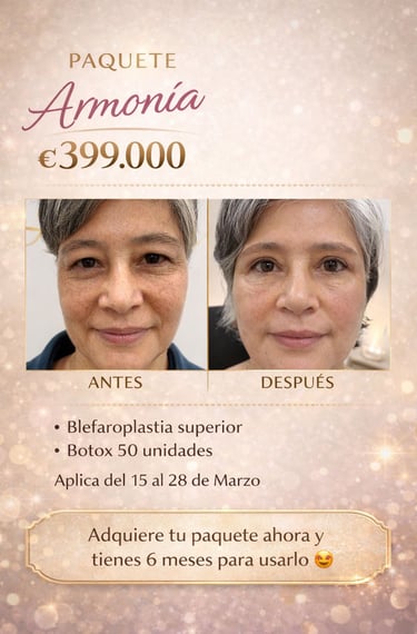 Presentamos el Paquete Armonía por ₡399.000. Incluye blefaroplastia superior y botox 50 unidades. Aplica del 15 al 28 de marzo. Adquirilo ahora y tenés 6 meses para usarlo.